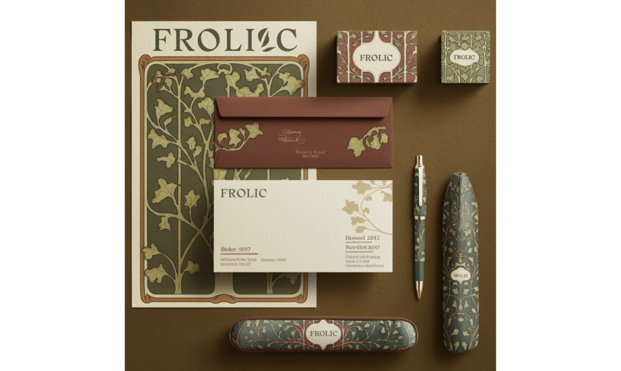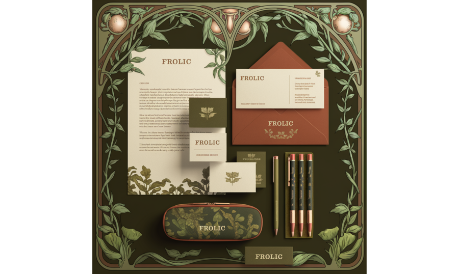 /imagineprompt; https://ideogram.ai/assets/image/lossless/response/2lSYRTZ2TRKkhHs9CW1RUA generate a mockup of printed materials (paper, envelope, business cards, pens, pencil case) on a white background for the FROLIC brand in Art Nouveau style using colours such as deep greens, warm browns, or muted golds, to evoke a sense of nature and tranquility. The overall composition should achieve visual balance, with the vines complementing the text while embodying the essence of modern movement and celebrating the intricate beauty of Art Nouveau. Make sure that https://ideogram.ai/assets/image/lossless/response/2lSYRTZ2TRKkhHs9CW1RUA appears on the objects as a logo exactly the way it is