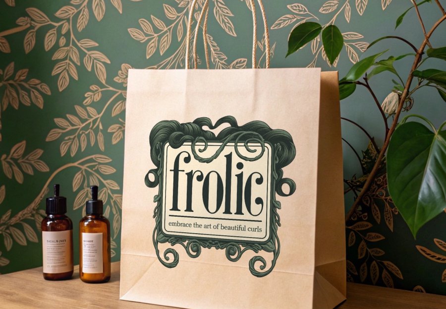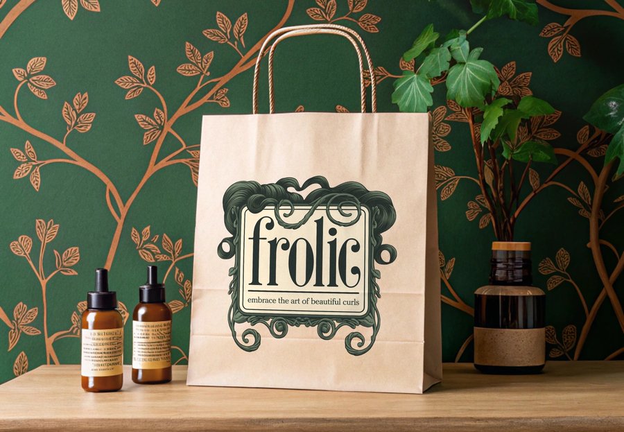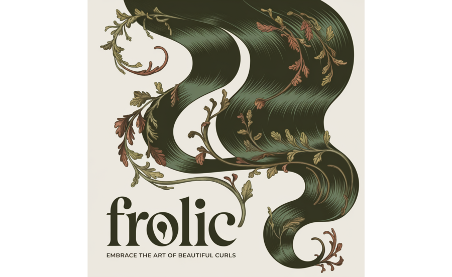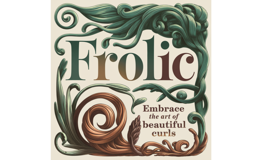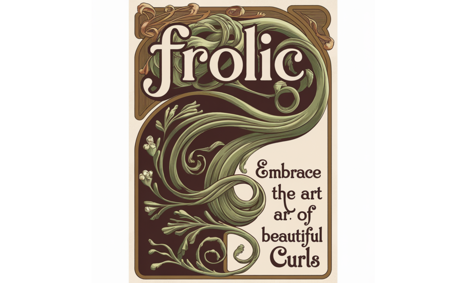 ideogram.ai /imagine prompt; Design a logo for a hair the brand called «Frolic». The logo should have the word «FROLIC» on it, the slogan,"Embrace the Art of Beautiful Curls «, and decorative graphic elements. The text should be in the Art Nouveau style, the brand name Frolic written in a thick, flowy serif font that conveys elegance and playfulness. The text should be centered within a square frame, surrounded by decorative plant-like vines that curl around it like hair, enhancing the whimsical feel without interlocking with the letters. Use Art Nouveau tones for the logo, such as deep greens, warm browns, or muted golds, to evoke a sense of nature and tranquility. The overall composition should achieve visual balance, with the vines complementing the text while embodying the essence of modern movement and celebrating the intricate beauty of Art Nouveau.