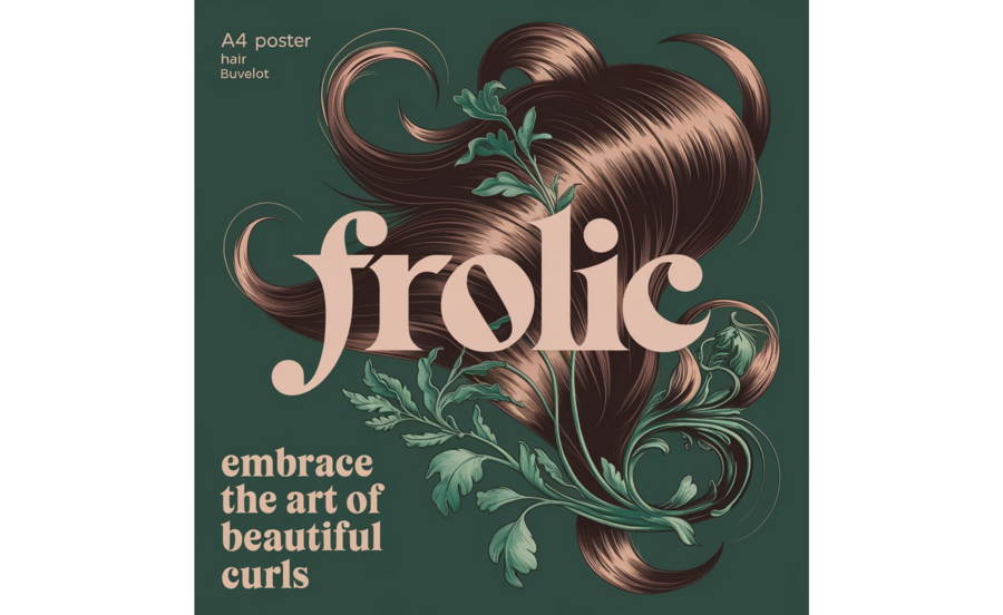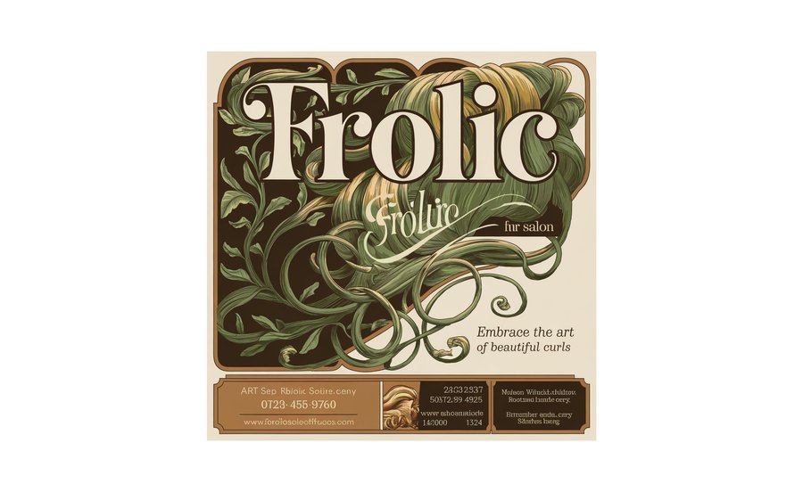 Image prompt; https://ideogram.ai/assets/image/lossless/response/DLZ3S-UeSSinVDy-jjp7IQ, An A4 poster for a hair saloon brand called «Frolic», with art nouveau, decorative plant-like vines botanicals that curl around it like hair with thick, flowy serif font typography, atlach — nacha, deep greens, warm browns, or muted golds, to evoke a sense of nature and tranquility, inspired by Louis Buvelot. The poster can have text on it including the brand slogan «Embrace the Art of Beautiful Curls. You can also add text blocks with the address, phone number, email, and maybe some information about the saloon to make the poster more informative