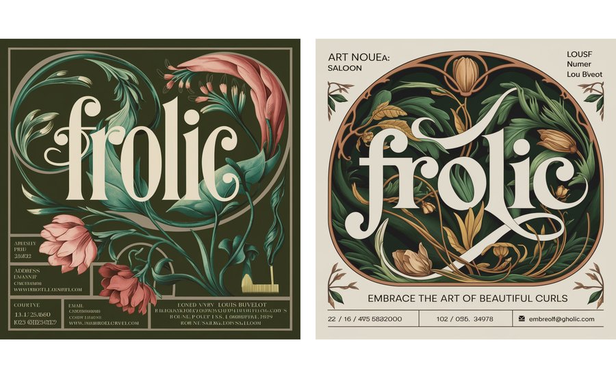 ideogram.ai /imagine prompt; A logo for a hair brand called «Frolic». The logo has the word «FROLIC» in the Art Nouveau style, written in a thick, flowy serif font. The text is centered within a square frame. Surrounding the text are decorative plant-like vines that curl around it like hair. The vines are deep green. Below the text is the slogan «Embrace the Art of Beautiful Curls». The overall logo has a whimsical feel and is designed in Art Nouveau tones. Make it look more like Art Nouveau