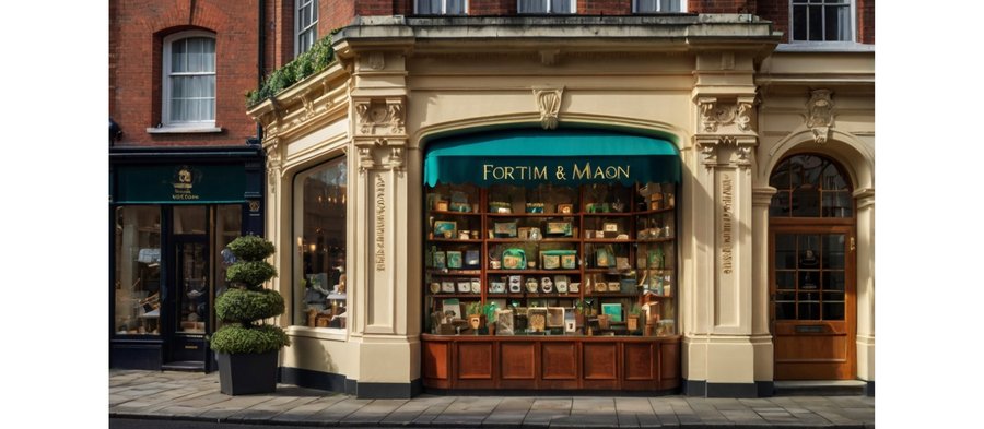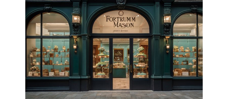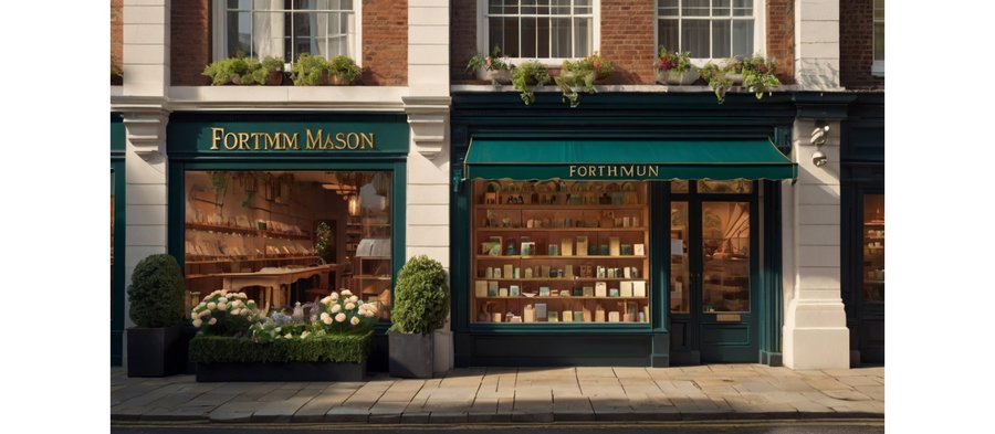 Image prompt; A photorealistic image of a building with a sign that says fortnum and mason, instagram contest winner, chrysanthemums, looking nostalgic, lush, lots of jars and boxes of herbs, epically luminous image, logos, dentils, inspired by Robert Brackman, listing image, extraordinary, grand piano, violins, and guitars displayed inside the store, replacing traditional shelving, with meticulous details and realistic lighting, making the scene feel even more lifelike.