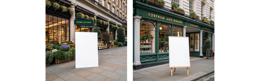 3.An outdoor day light mockup for a plain white A4 poster. The poster is facing directly towards the camera. At the back ground there is a building with a sign that says Fortnum and mason, instagram contest winner, chrysanthemums, looking nostalgic, lush, lots of jars and boxes of herbs, epically luminous image, logos, dentils, inspired by Robert Brackman, listing image, extraordinary, grand piano, violins, and guitars displayed inside the store, replacing traditional shelving, with meticulous details and realistic lighting, making the scene feel even more lifelike.