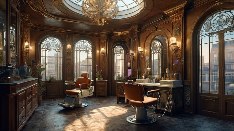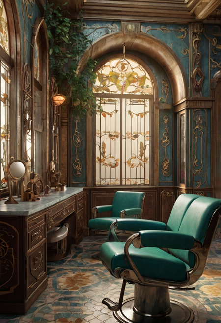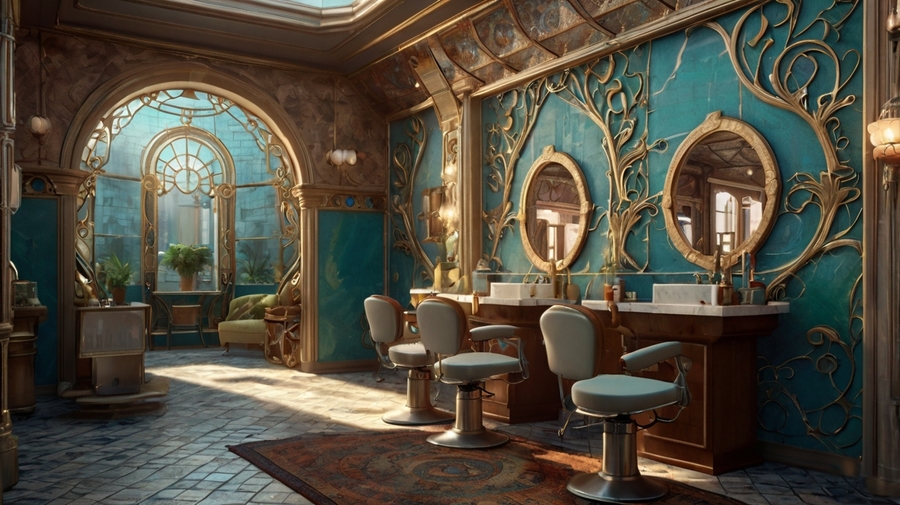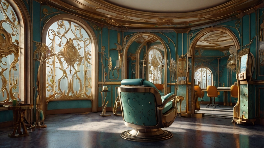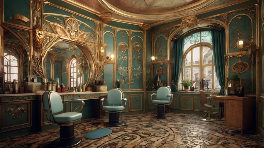Итоговый промпт; A hyper realistic photo of a hair salon with a stylist’s chair and a reception table, art nouveau 3d curves and swirls, vray beautiful, epic 3 d yemaya, archways, very coherent. high detail, photo of a painting, beautiful salon, dieselpunk biological living, rubenesque, by Frances Jetter, (art station), elven palace of ghemathar, exquisite detail, hair dryers and styling tools adorn the walls and countertops, with ornate mirrors and lavish decorations.