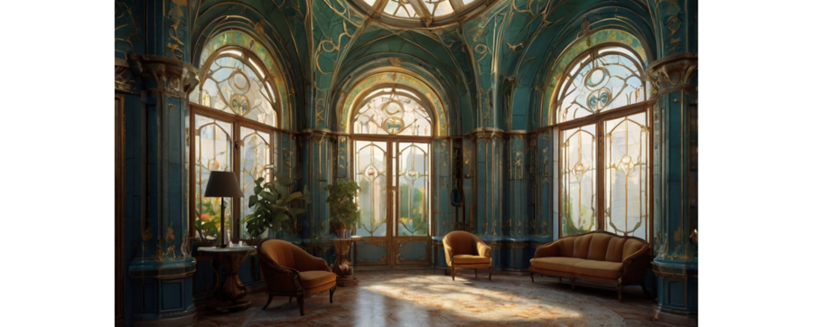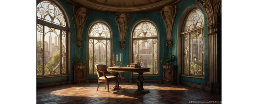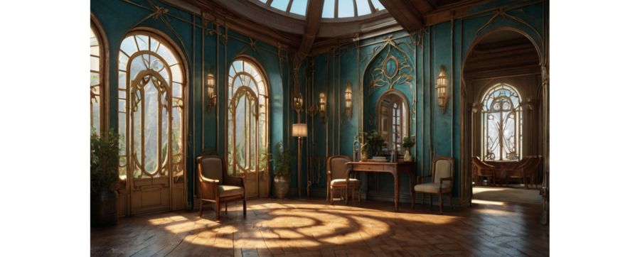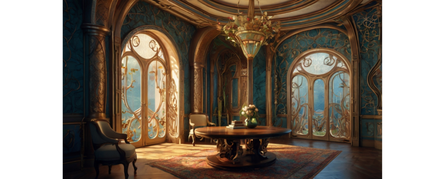 Исходный промпт; A hyper realistic photo of a room with a chair and a table, art nouveau 3d curves and swirls, vray beautiful, epic 3 d yemaya, archways, very coherent. high detail, photo of a painting, beatiful house, dieselpunk biological living, rubenesque, by Frances Jetter, (art station), elven palace of ghemathar, exquisite detail