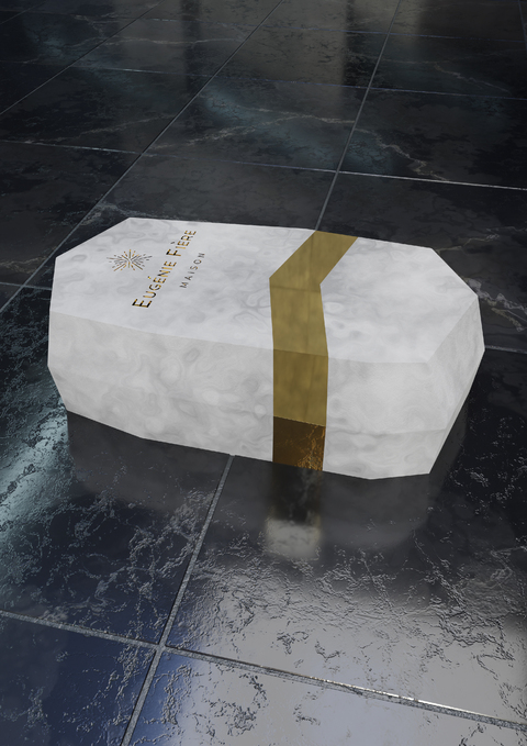 The original style of Eugenie Fiere Maison is reflected in the design of the table for the interior of the showroom of the same name in the material of microcement and gold piping, embodying the luxury casual style that is sewn into the DNA of the brand.