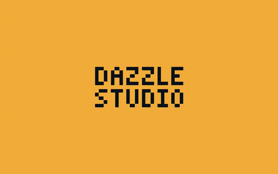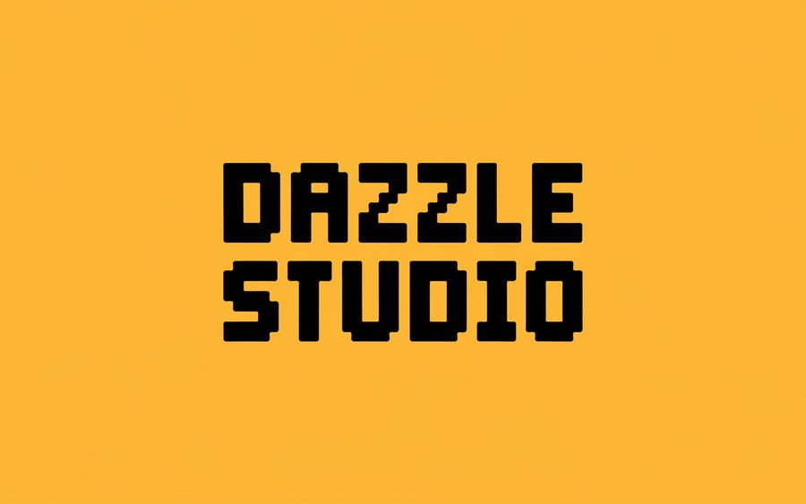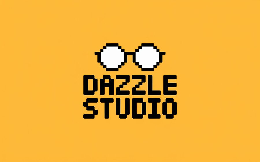 /imagine prompt: Create a sunglasses brand logo, yellow background, black pixelated or rounded 'Dazzle Studio' lettering, minimalist design, modern style with quirky aesthetics, unique and creative sunglasses brand