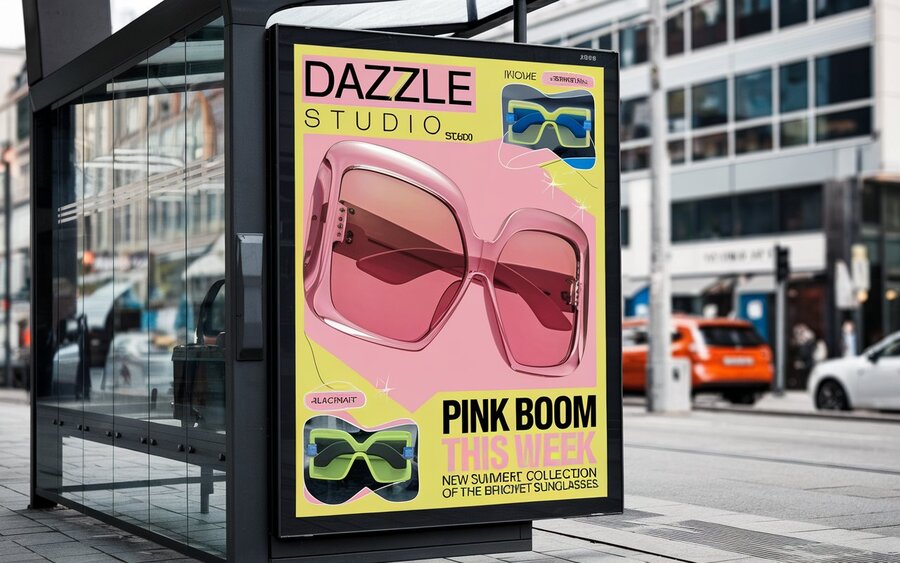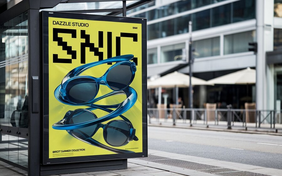 /imagine prompt: Captivating promotional poster for Dazzle Studio sunglasses. An urban bus stop advertisement with a bright yellow background showcasing a modern and artistic design. The main focus is on a pair of sleek, glossy blue sunglasses and their reflection, intertwined in an abstract, futuristic arrangement. The bold, pixelated black text reads «SNIC,» adding a trendy digital feel. Below, smaller text mentions «Bright Summer Collection.» The setting includes urban architecture, fences, and a calm city street with natural lighting, creating a contemporary and fashionable scene.