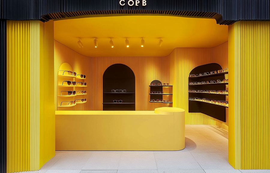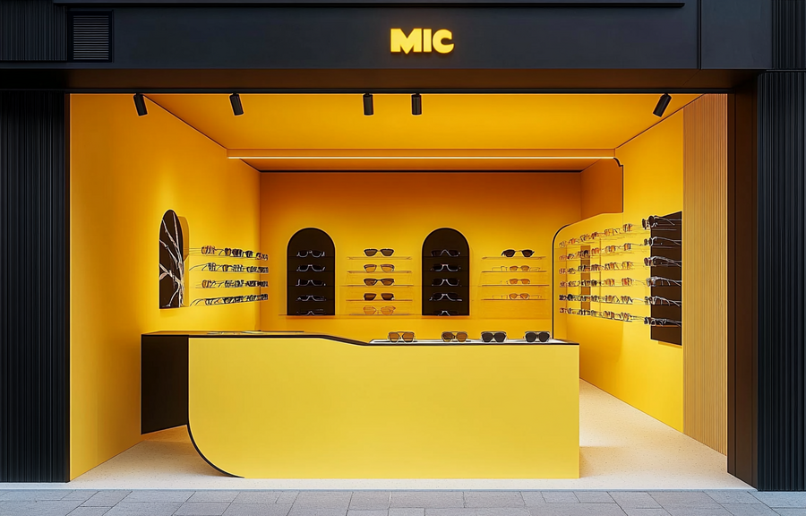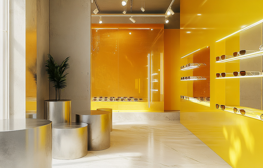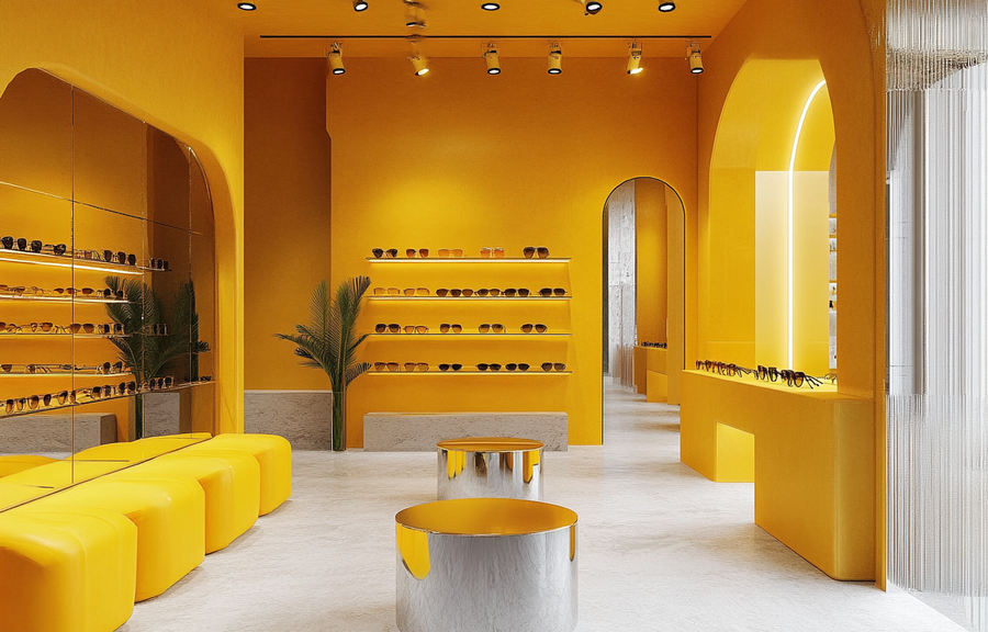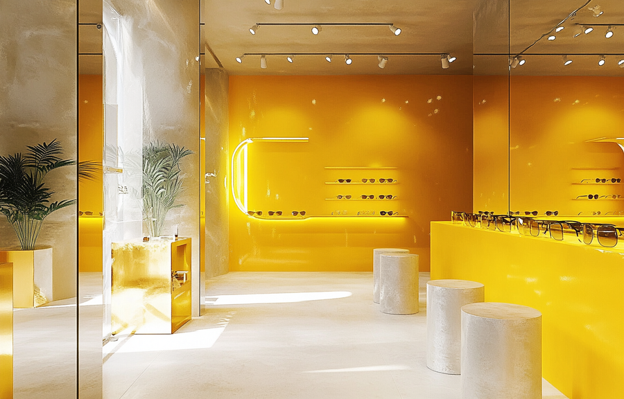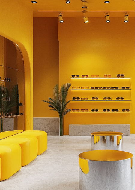Так же я решила создать интерьер магазина Dazzle Studio, который я сгенерила в ideogram. /imagine prompt: generate a realistic store for a sunglasses brand. The store is modern in yellow and metallic shades
