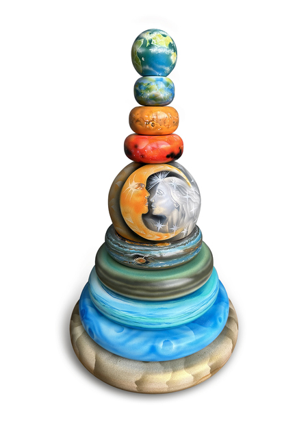 The interior toy «Astrologer’s Pyramid» is created for people who areinterested in space, astronomy and astrology. Representation of the solar system through the prism of astrologicalperception. The center, or rather the point of the observer is on theEarth, so it is symbolically the top of the pyramid. Further there are planets close to the Sun and the Earth, they arepersonal planets in the natal chart of the person. These are Mercury, Venus and Mars. The second conditional center is a figure of connection of the Sun andthe Moon — consciousness and subconsciousness, world perception ofthe person, the union of the mental and astral planes of the mind andsoul. The powerful basis of the pyramid are the big social planets: Jupiter, Saturn, Uranus, Neptune and the final Pluton.