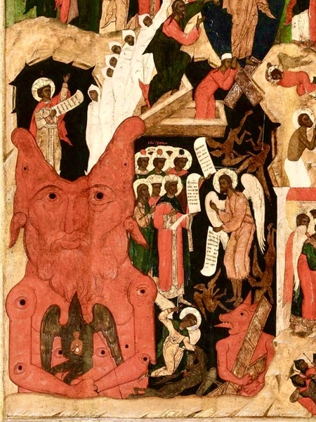 Начиная с XVI века в композиции «Сошествия во ад» происходят самые неожиданные метаморфозы. Ад предстаёт в новых формах: из земли вырастает огромная красная человеческая голова, раздвоенная в верхней части, подобно пасти, или красный великан по пояс. При этом зверь-ад, как и пространство ада, не исчезают. Особо наглядным примером является зверь-ад в иконе Дионисия Гринкова «Воскресение Христово — Сошествие во ад, с праздниками». Он представлен внутри пространства ада. Инфернальные монстры в иконографии умножаются, изображая одного и того же персонажа, чья роль, согласно текстам вроде апокрифического Евангелия Никодима, — пытаться извращённо подражать и сопротивляться Христу. *Изображение: Воскресение с Сошествием во ад (фрагмент) / Россия, втор. пол. XVI века / Ярославский художественный музей