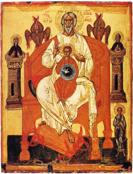 Наиболее символически насыщенным мотивом стала «адская троица». На некоторых иконах великан-Ад держит на коленях дьявола, а тот, в свою очередь, — Иуду. Эта пирамида была сознательной аллюзией на иконографию «Троицы-Отечества». Сама иконография «Отечества» имеет неоднозначный статус в православной традиции, так как изображает Бога-Отца, которого «…никто никогда не видел, Его явил нам единственный Сын Его, пребывающий у самого сердца Отца, и Который Сам — Бог» (Ин. 1:18). Сама иконография взята из западной традиции. *Изображение: Сошествие во ад (фрагмент) / Россия, втор. пол. XVI века / Владимиро-Суздальский музей