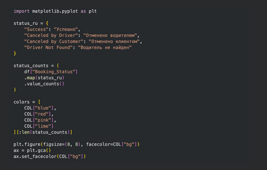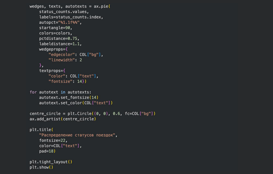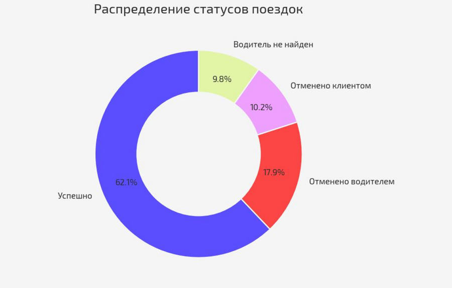 Частотный анализ категориальных данных — применялся при подсчёте количества поездок по статусам бронирования и визуализировался с помощью круговой (donut) диаграммы «Распределение статусов поездок». Метод позволил оценить доли успешных и проблемных заказов.