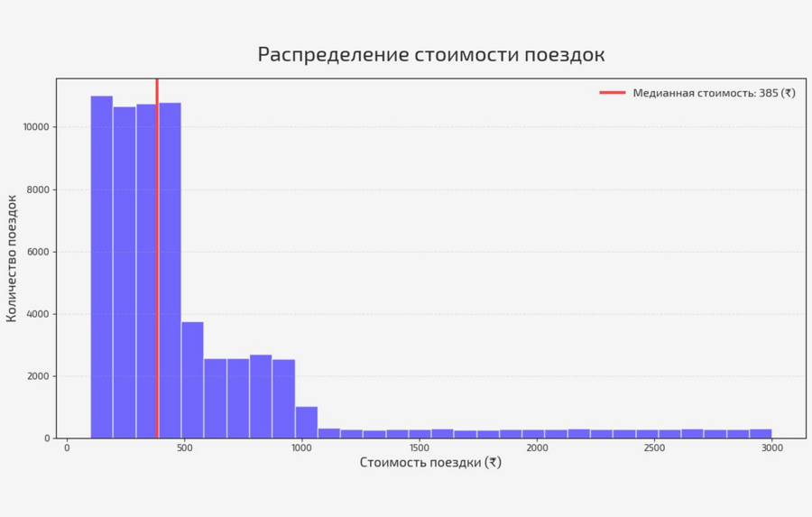 На графике также отмечена медианная стоимость — она составляет 385 рупий. Для перевода в рубли можно использовать приближённый курс: 1 индийская рупия ≈ 1,1 рубля Соответственно: медианная стоимость поездки ≈ 420–430 рублей большинство поездок укладывается в диапазон примерно 200–600 рублей
