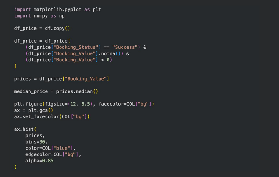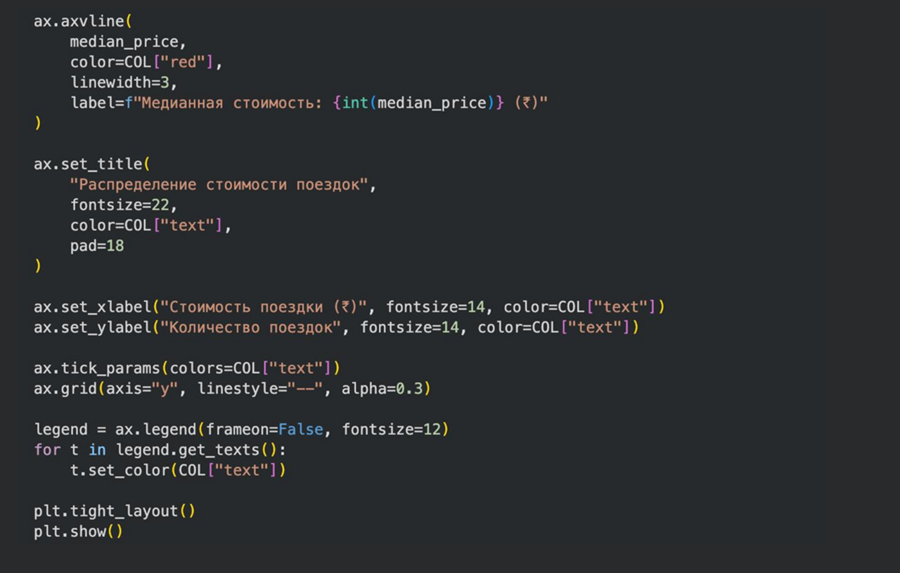 Анализ распределения и меры центральной тенденции (медиана) — использовался при исследовании стоимости успешных поездок. Гистограмма в сочетании с вертикальной линией медианы в графике «Распределение стоимости поездок» позволила оценить типичную цену и асимметрию распределения.