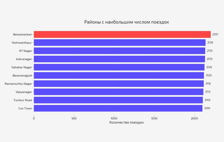 Горизонтальная столбчатая диаграмма отображает районы города с наибольшим количеством поездок. По вертикальной оси перечислены районы, по горизонтальной — количество заказов. Такой формат удобен для сравнения значений между локациями.