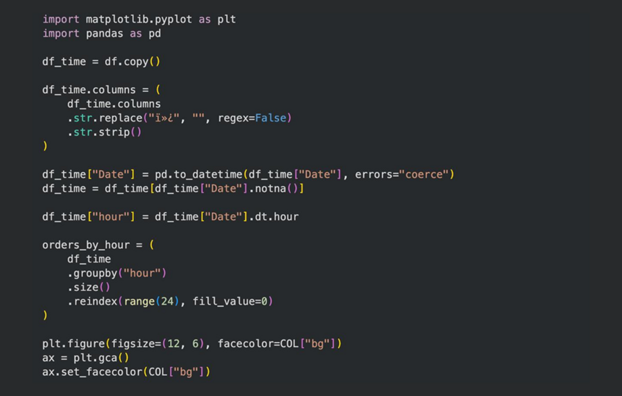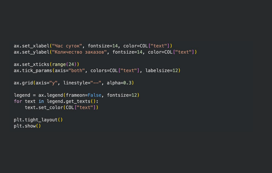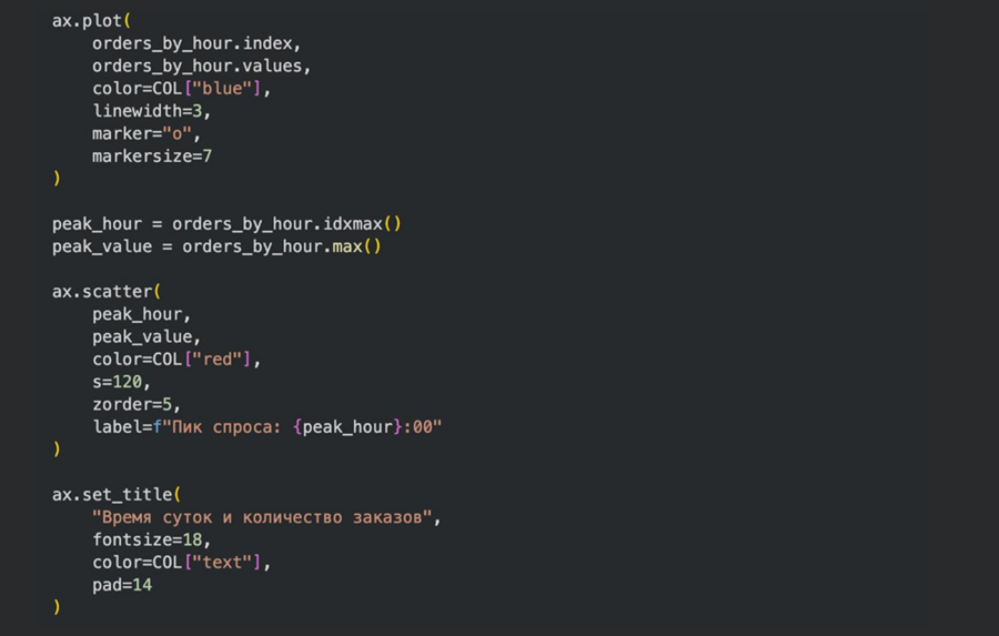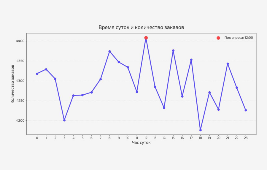 Поиск экстремальных значений во временных рядах — применялся для определения часа максимального числа заказов, который был дополнительно выделен маркером на линейном графике, что усилило интерпретацию пиковых нагрузок.
