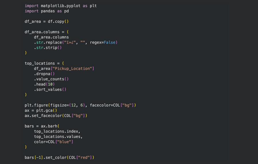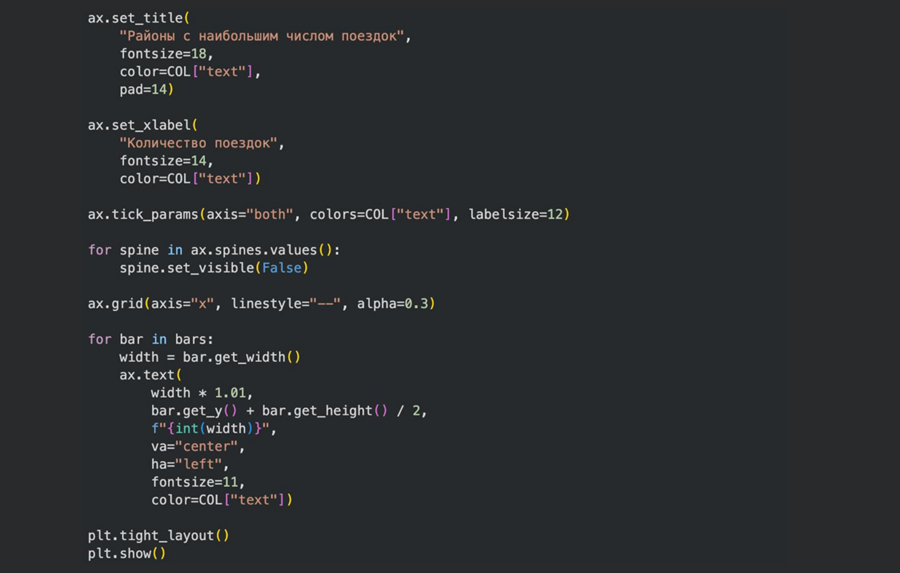 Ранжирование и отбор топ-N категорий — использовался для выявления наиболее популярных районов посадки пассажиров. Горизонтальная столбчатая диаграмма «Районы с наибольшим числом поездок» отражает сравнительный анализ локаций по частоте поездок.