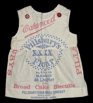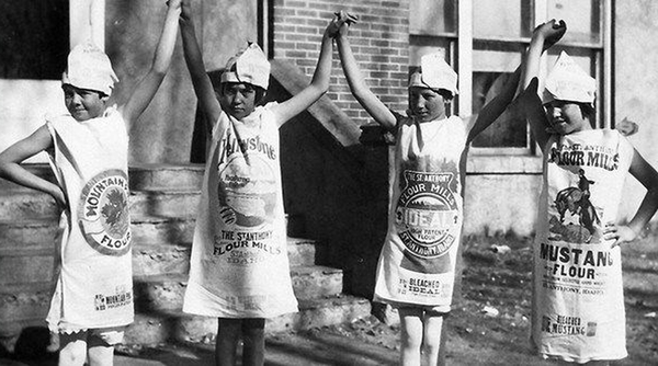 Во время Великой депрессии обострившийся дефицит тканей заставил многие семьи обращаться к тем материалам, которые были доступны бесплатно или стоили минимально. Мешковина — прежде всего хлопковые и джутовые мешки из-под муки, сахара, зерна или кормов — стала одним из самых распространённых заменителей полноценной ткани.
