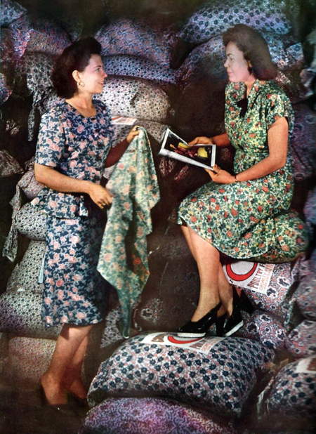1. Женщины в платьях из декоративных мешков. США, 1947 год.; 2. Мука упакована в новые принтованные мешки. Ли Рассел. Техас, февраль 1939 года