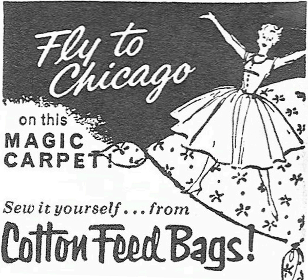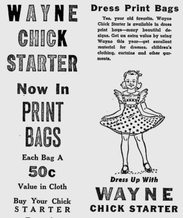 1. Тканевые мешки с принтами. Канзас-Сити, Миссури, 1947 год.; 2. Газетная реклама Wayne Chick Starter в мешках с тканевым принтом. 19 апреля 1945 года