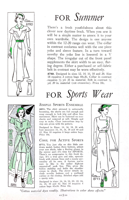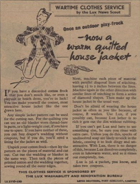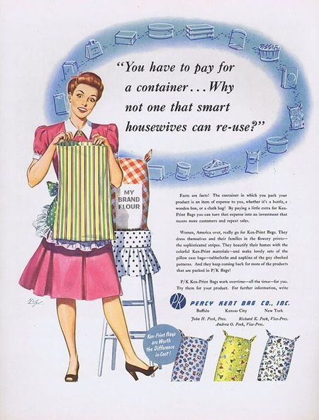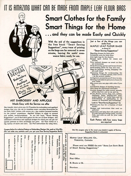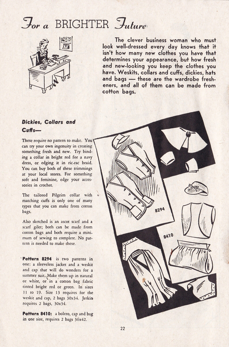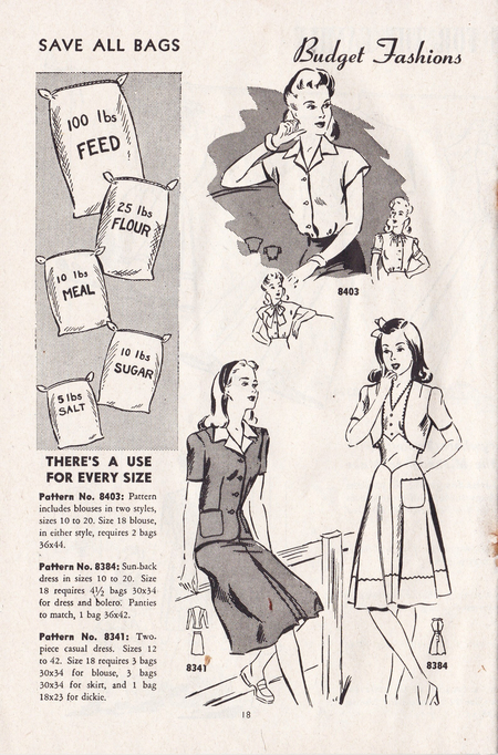 В 1930–40-е годы навыки домашнего шитья становятся массовым и почти универсальным умением, во многом благодаря доступным практическим руководствам, которые активно распространялись в годы дефицита. Одними из самых заметных были издания, посвящённые работе с хлопковыми мешками и экономному крою: Sewing With Cotton Bags предлагал читателям варианты использования мешочных тканей.