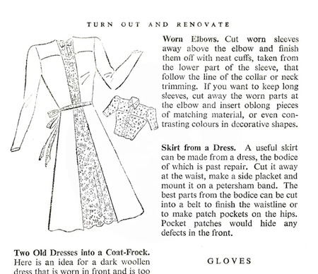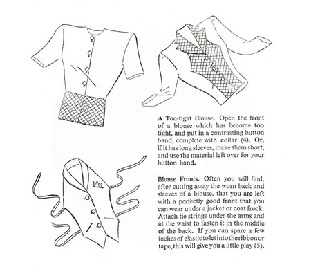 Даже обновление устаревших фасонов происходило исключительно из необходимости — старые платья укорачивали, меняли линию талии, превращали в юбки, укорачивали рукава у блуз, добавляли декоративные вставки, из двух старых вещей делали одну новую, шили из остатков ткани.