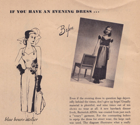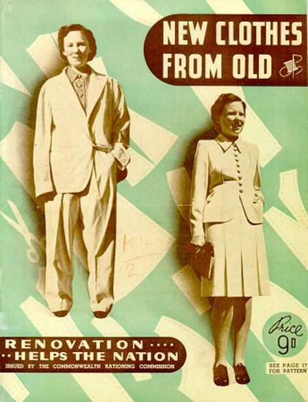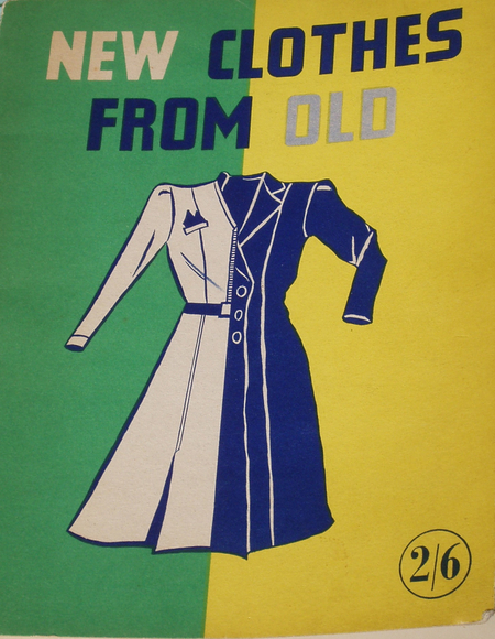 1. Журнал New Clothes From Old. 1940-е годы.; 2. Женщина демонстрирует пример одежды периода жёсткой экономии. 1940-е годы