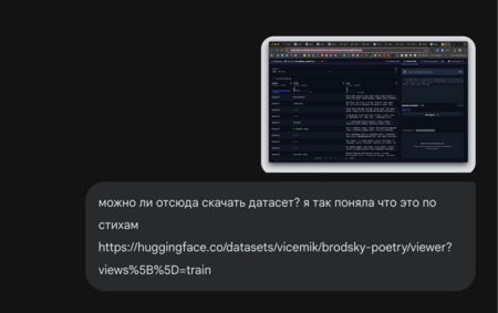 Для анализа данных я использую датасет brodsky-poetry с корпусом поэтических текстов Иосифа Бродского (более 650 произведений) в Hugging Face. Набор данных включает тексты стихотворений, их названия и метаданные.