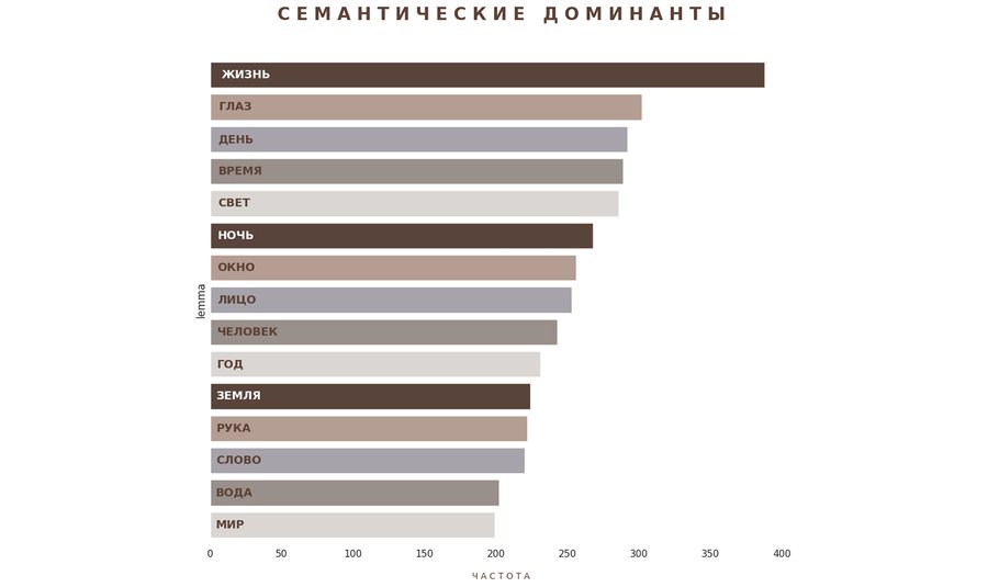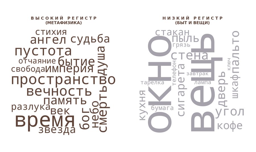 На данном графике мы видим 15 главных слов-концептов в творчестве Бродского. Поэтическая вселенная держится на балансе между абстрактными категориями и предельно осязаемыми предметами