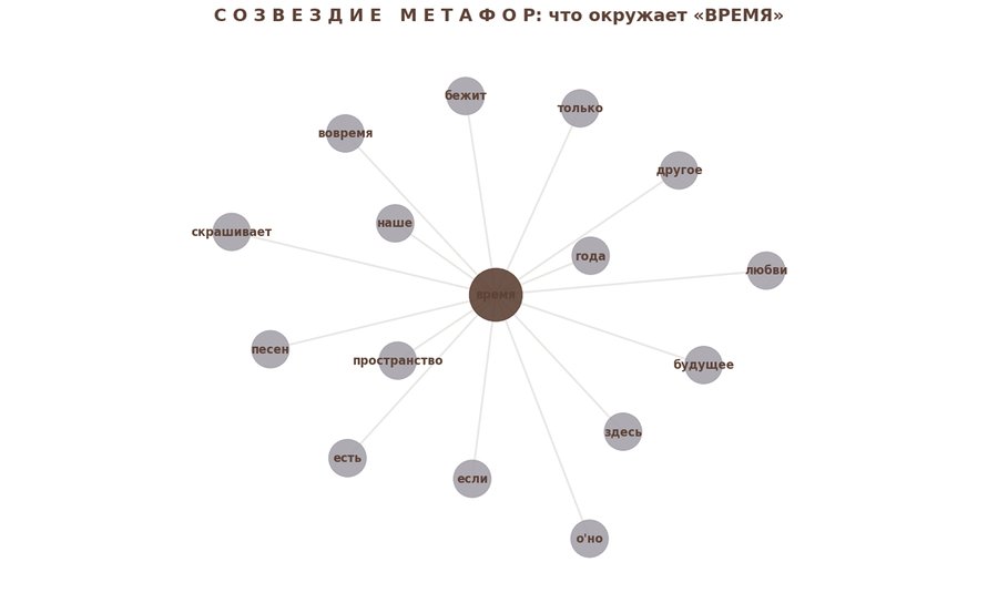 Это «Созвездие метафор» — визуализация того, какие смыслы чаще всего притягиваются к слову «время» в поэзии Бродского.