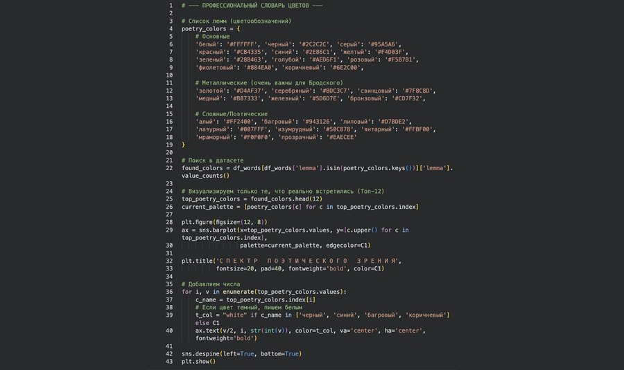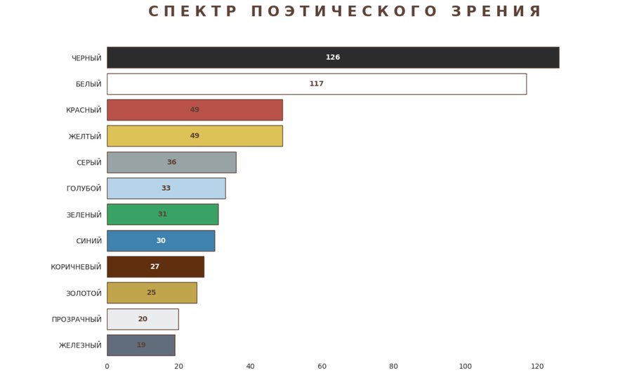 Частотный лексический анализ с использованием словаря цветовых маркеров. График демонстрирует «графичность» художественного мира Бродского. Доминирование черного (126) и белого (117) цветов над спектральными (красным, желтым) подтверждает ахроматичность его лирики.