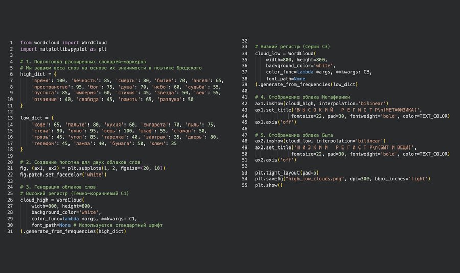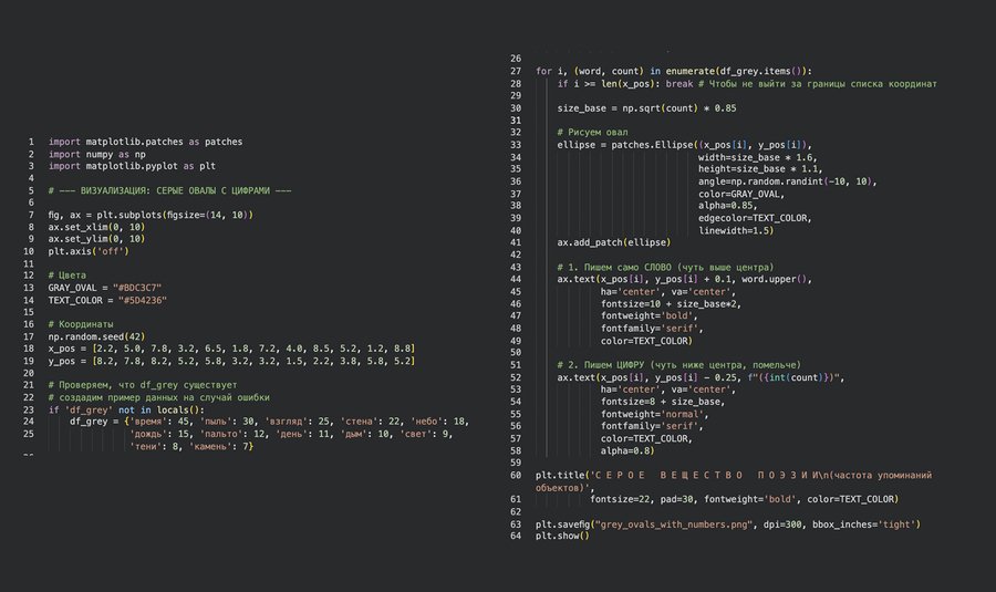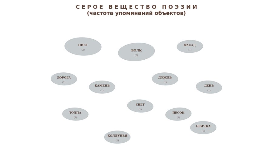 Примеры: «Маятник регистров» (два облака слов) или «Серые овалы». Цель: Акцентировать внимание на выводах. Функция визуализаций: Эти графики созданы для проверки и наглядной иллюстрации конкретных литературоведческих теорий. Например, тезис «Бродский — поэт серого цвета» демонстрируется через анализ данных с акцентом на ключевые слова («время», «вещь»). Аналогичным образом визуализации позволяют проиллюстрировать теорию бинарности мира Бродского (быт vs. метафизика).