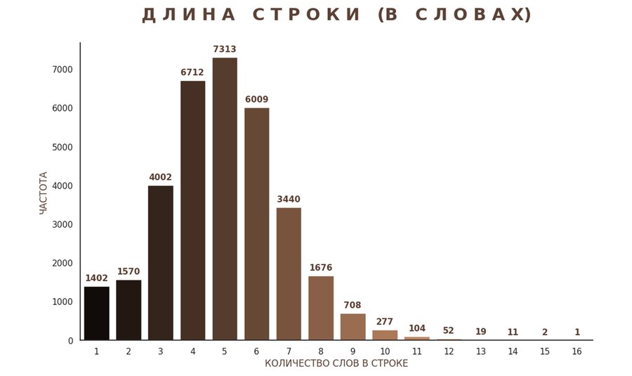 Анализ распределения длины строки показывает, что средний размер строки сосредоточен в диапазоне 4–7 слов. Это свидетельствует о доминировании классических размеров (в первую очередь пятистопного и шестистопного ямба), которые являются метрическим фундаментом его творчества.