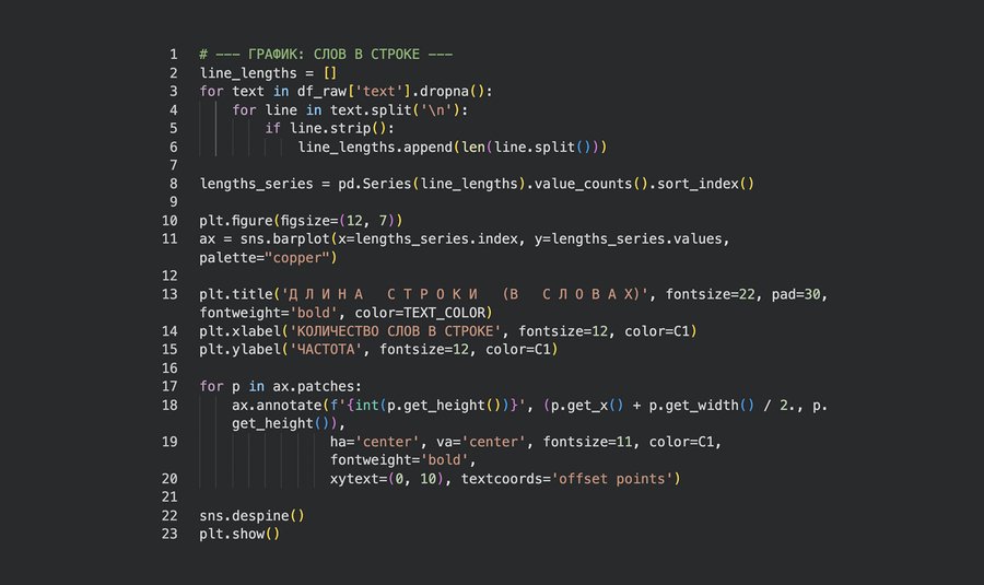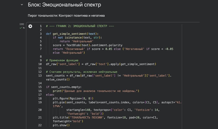 Мне понравилось проводить это исследование. Анализировать язык поэзии через графики оказалось увлекательно и наглядно. Я научилась обрабатывать текст, очищать его от служебных слов и работать с датасетом; извлекать из большого количества данных необходимую информацию.
