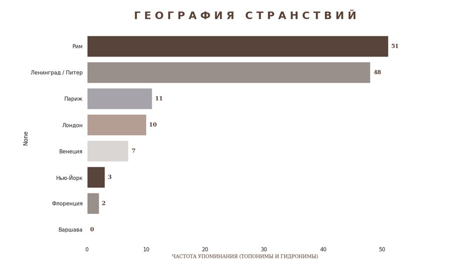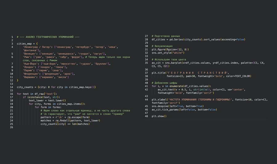 Повторяемость одних и тех же городов указывает на фиксированный набор пространственных опор, которые функционируют не как географические, а как символические точки. Пространство в текстах оказывается скорее концептуальным, чем описательным.