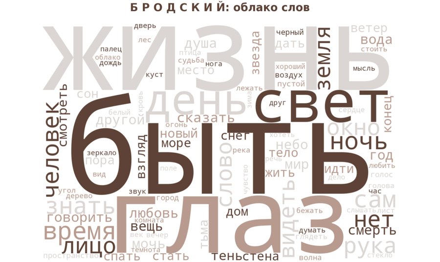 Этот график — «Вербальное поле поэта» (Облако слов) — представляет собой визуальную карту смысловых приоритетов в поэтическом корпусе И. Бродского. Облако визуализирует наиболее часто встречающиеся фразы, где размер слова соответствует его частоте.