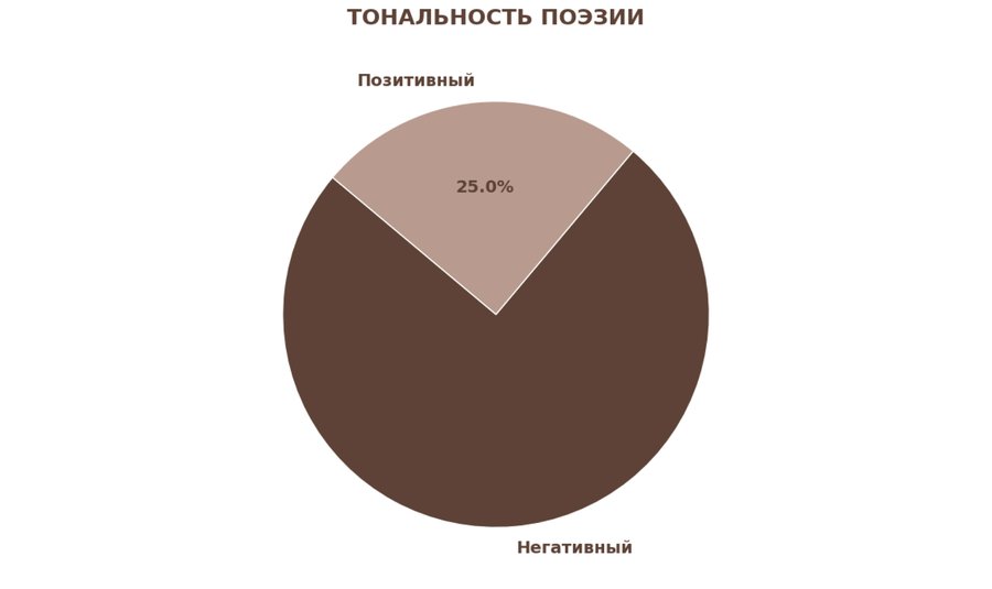 Автоматический анализ тональности показывает преобладание негативной лексики. Однако это не означает депрессивность автора. Это визуализация «поэтики отсутствия» Бродского, где ключевые для него понятия — холод, дистанция и пустота — алгоритмически считываются как негативные, но являются фундаментом его художественного мира