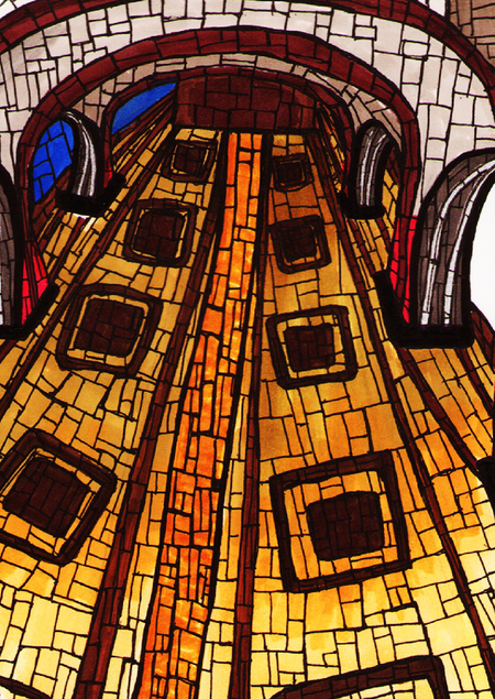 Я включила один из этих витражей в рисунок как образ света и узора среди архитектурных ритмов станции — здесь цвета и формы становятся живой частью поверхности стены, а сама станция кажется сказочным, почти подводным миром, погружённым в движение города.