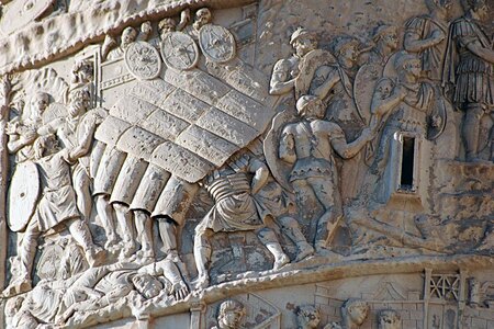 Идея массы как защитного организма получает развитие в «Колонне Траяна», где солдаты изображены в построении «черепаха». Щиты, сомкнутые друг с другом, формируют плотную поверхность, напоминающую панцирь. Эта композиция представляет собой пример коллективного тела, которое изменяет собственную форму, превращаясь в искусственную конструкцию. Масса здесь — живая архитектура, наглядная демонстрация дисциплины, продуманности и способности множества функционировать как одно целое.
