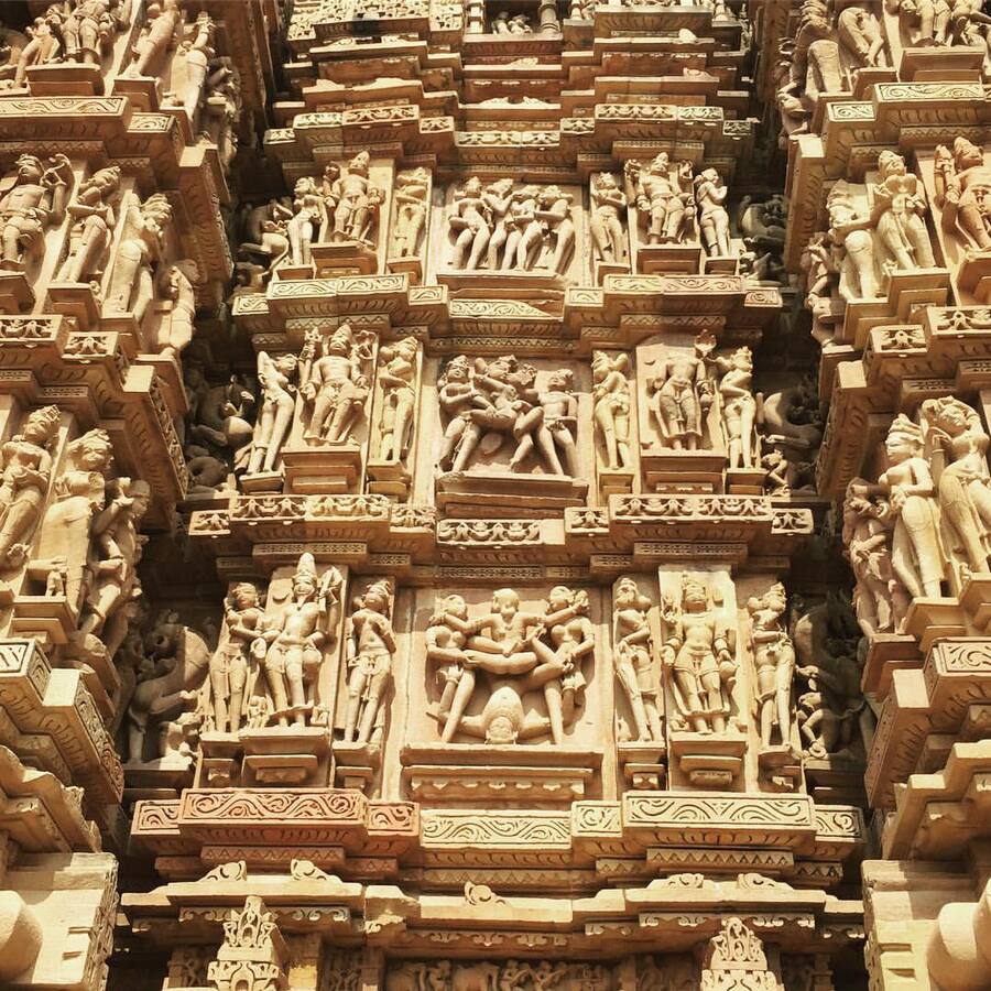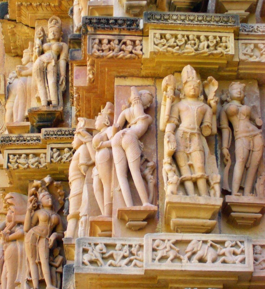 В скульптурных ансамблях храмов Кхаджурахо масса приобретает другое значение. Здесь множество тел превращено в ритмический орнамент, в живую декоративную поверхность. Фигуры, расположенные рядами, повторяют друг друга, формируя плотную композицию, где движения и позы сливаются в единый пластический поток. Масса здесь выполняет эстетическую функцию, становясь элементом гармонии и непрерывности. Люди — часть общего узора, структура которого подчёркивает цикличность и ритм жизни.