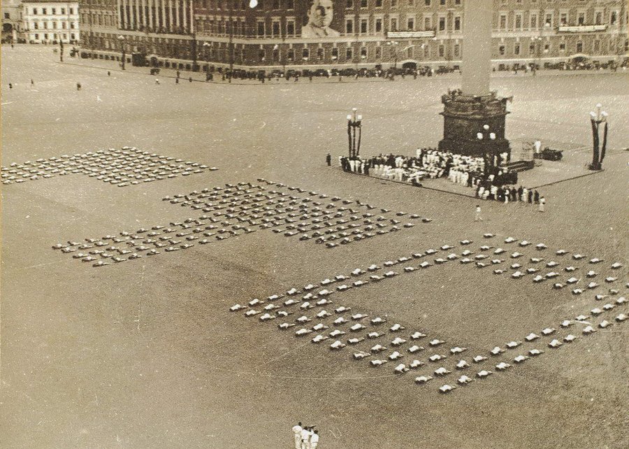 Парад физкультурников 1933 года в Ленинграде раскрывает этот принцип особенно наглядно. Участники формируют ровные колонны, которые движутся как единый организм. Взгляд наблюдателя фиксирует не индивидуальные лица, а линии движения. Это форма визуальной дисциплины, где каждый человек — часть конструкции, создающей образ социалистического порядка и организованного общества.