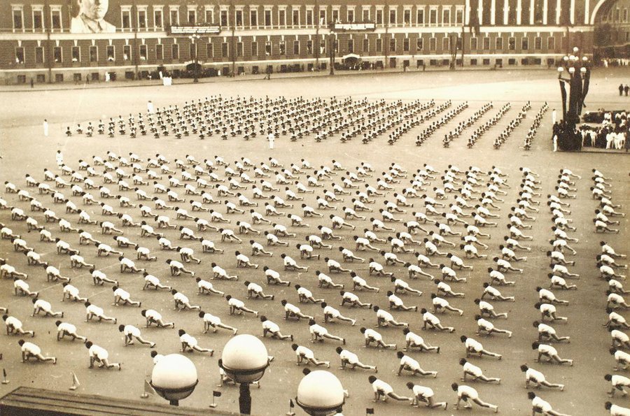 Физкультурные парады СССР, включая многочисленные фотографии Васина, строятся на принципе превращения множества людей в пиксельную поверхность, из которой образуются слова, лозунги и фигуры. Человеческие тела выполняют функцию знаков, а сама масса используется как экран. В этом случае энергия массы направляется на демонстрацию идеологического единства, а согласованность движений становится доказательством способности общества действовать как одно.