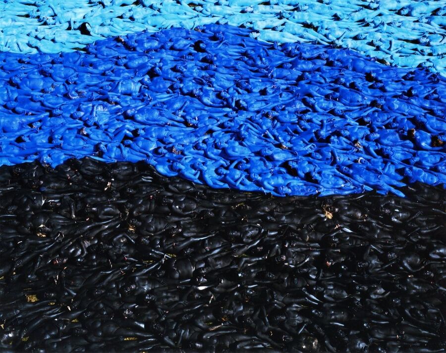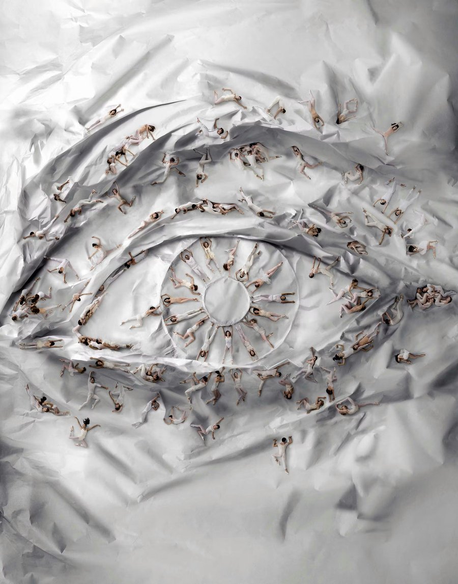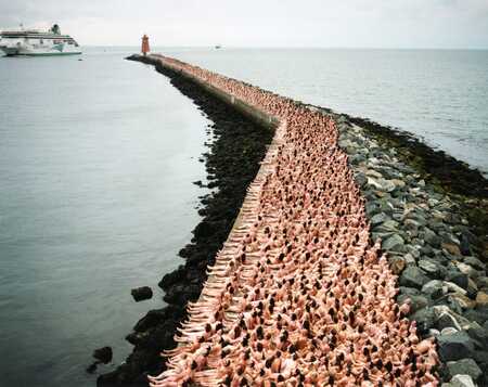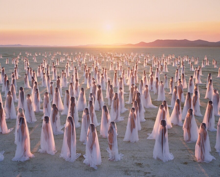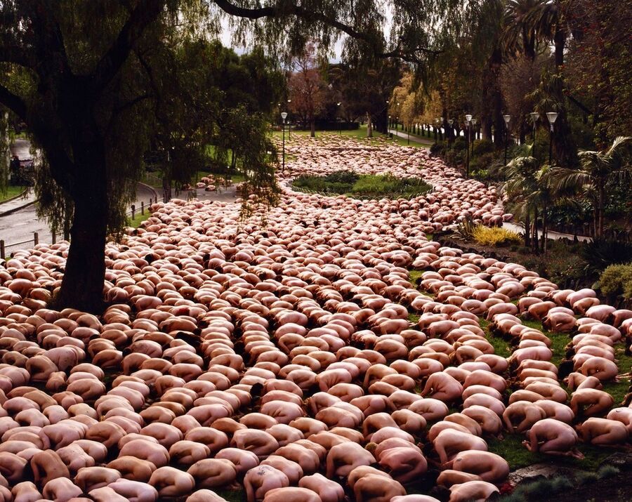 Работы Spencer Tunick развивают идею массы как эстетического материала. Художник использует обнажённые тела, которые формируют плотные поля, волны, спирали или хаотические распределения. В этих композициях исчезает индивидуальность, но возникает новая красота — структура из множества. Фотографии Туника фиксируют момент, когда тело множества становится природной формой, похожей на ландшафт. Это принципиально новый подход: масса превращается в эстетический жест, подчёркивающий природную хрупкость и разнообразие человеческой фигуры.