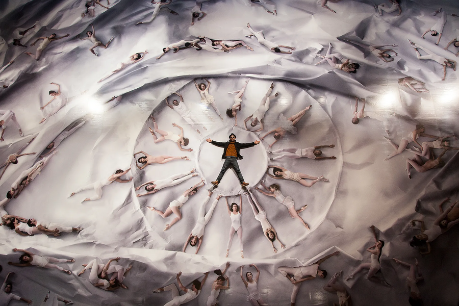 Инсталляции JR используют тела для создания гигантских изображений, в которых участие людей становится частью художественного процесса. Танцоры, выстроенные на огромном полотне, создают единую поверхность изображения, где каждый человек выступает как штрих. JR превращает массу в художественный медиум, в текстуру, которая позволяет взглянуть на коллектив как на единое изображение.