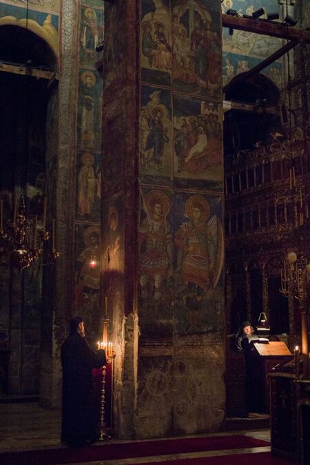 Сквозь эту среду прорываются звуковые сигналы: звон цепочек кадила, тихие молтивы, треск свечей. Звуки растворяются в общем акустическом поле, становясь голосом места. Это создаёт эффект сакрального звукового ландшафта, где человек ищет единство с Богом.