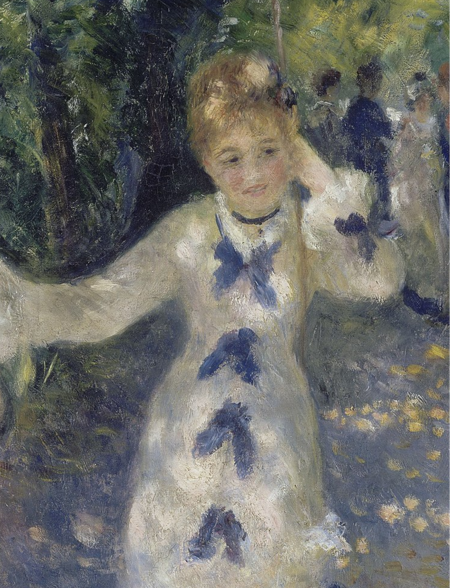 На картине «Качели» Ренуара мы видим, что глаза девушки изображены максимально просто — буквально парой мазков. Это связано с задачей направления живописи — передать общее вечатление.