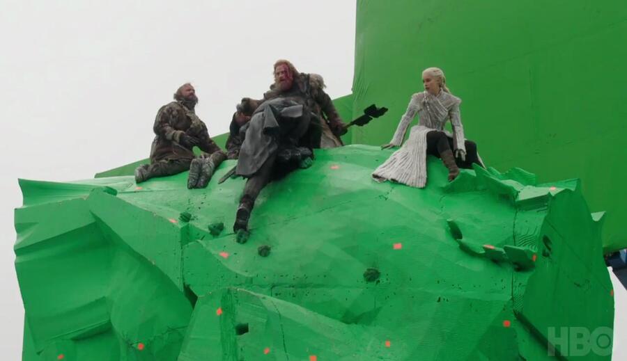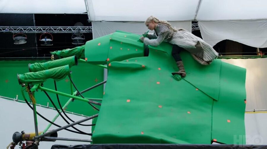 В студии роль дракона, на котором перемещалась Эмилия Кларк, выполнял покрытый пенопластом лётный симулятор.