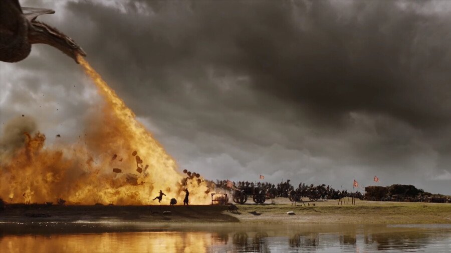 Основная сложность заключалась в том, чтобы пламя выглядело так, словно его выпускает дракон. Для этого нужно было не только точно размещать огнемёты и поджигать нужные поверхности, но и тщательно контролировать каждое движение камеры, чтобы её траектория полностью совпадала с направлением огненной струи.