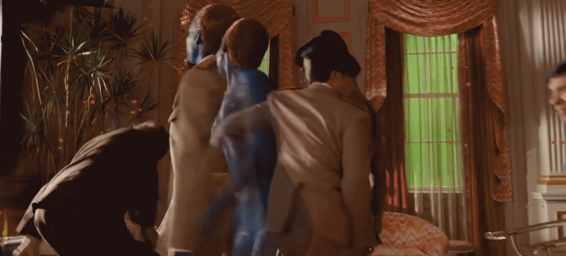 Скорость имитации дыма была санимирована отдельно, что позволяло ему взрываться в воздухе, а затем быстро замедляться, чтобы ненадолго зависнуть и двигаться с той же скоростью, что и остальной ветер на площадке. Также было добавлено лёгкое тепловое искажение, чтобы тело «расплывалось» от центра эффекта, создавая ощущение, будто он прошёл через портал, а не растворился.