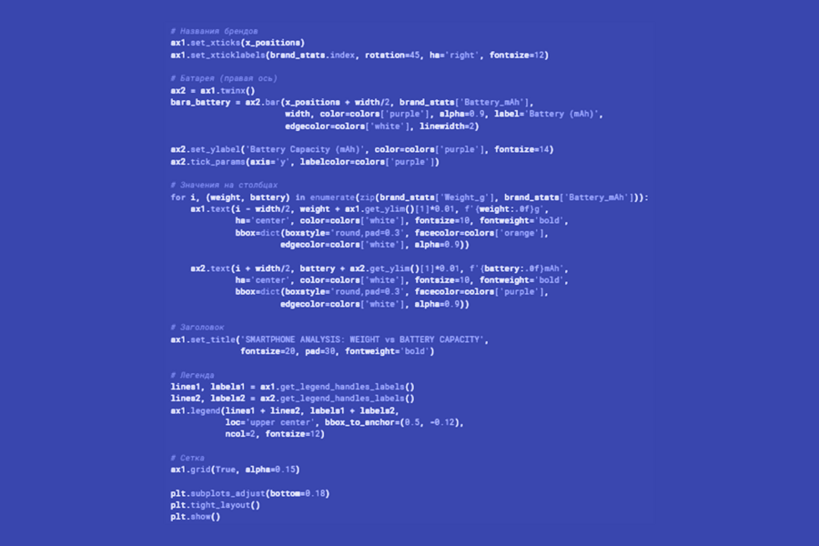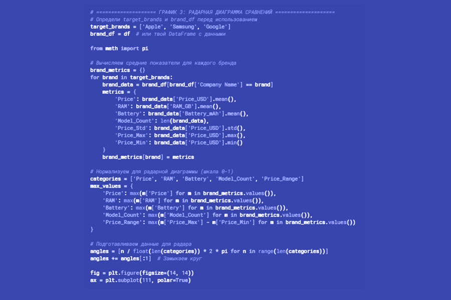 Для визуализации выбрано четыре типа графиков: двойная столбчатая диаграмму (наглядно сравнивает два параметра — вес и батарею), гистограмма (показывает распределение цен), радарная диаграмма (демонстрирует сильные и слабые стороны брендов) и пузырьковая диаграмма (визуализирует три параметра одновременно — цену, ОЗУ и количество моделей).